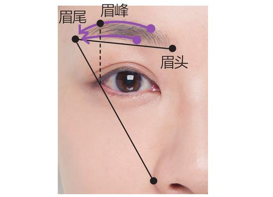 最开始让我们来确认一下自然状态下漂亮的眉尾和眉峰的位置吧。眉尾在联结鼻翼和外眼角的延长线上,与眉头下侧的线几乎相交于平行位置。眉峰则以外眼角延长线上的位置为准。只要记住这一点,描眉时就不会犹豫不决了。