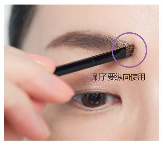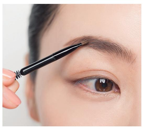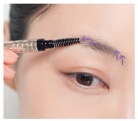 在描眉前,用螺旋刷梳理眉毛纹理。从眉头到眉中时向上梳理,眉中至眉尾时沿着眉尾方向,自然梳理。还可以先确认一下眉尾和眉峰的位置。
