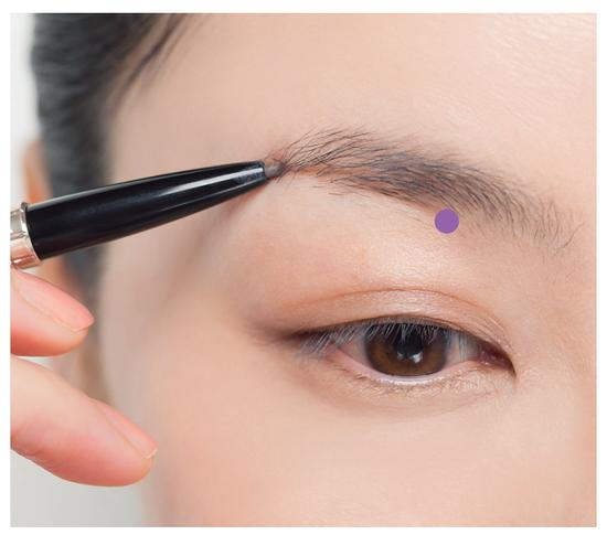 在向上生长的眉毛和朝眉尾生长的眉毛相互交错的位置上,用眉笔朝着眉尾方向,描画下方的线条。描绘出同眉头下侧平行的柔顺线条。