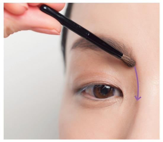 自然年轻的眉毛应该是眉头淡雅,眉中到眉尾蓬松厚重。如果只用眉笔描画就容易变得千篇一律,缺乏变化,难以画出好看的眉毛。因此,用眉笔画完后,最好用眉粉覆盖一下,这样就能轻松打造出厚重的感觉还能防止眉毛脱落,一举两得。
