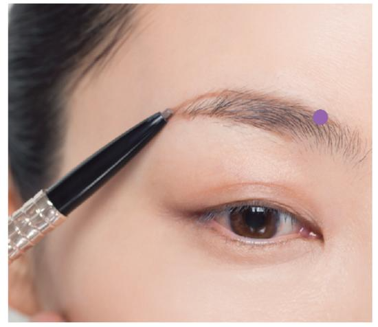 在向上生长的眉毛和朝眉尾生长的眉毛相互交错的位置上,用眉笔朝着眉尾方向,描画下方的线条。描绘出同眉头下侧平行的柔顺线条。